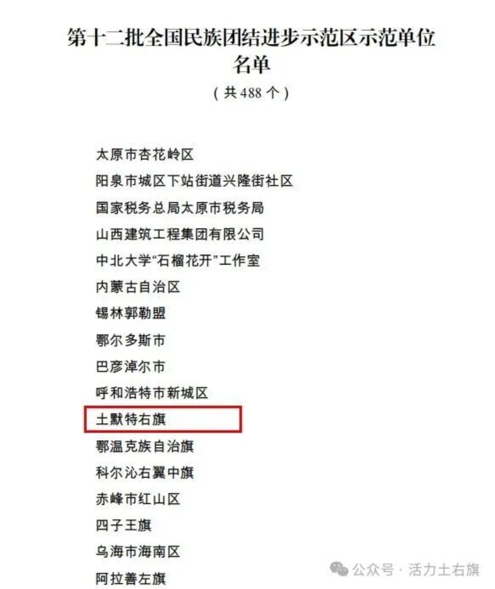 近日,国家民委印发《关于命名第十二批全国民族团结进步示范区示范单位的决定》,共命名488个先进典型。内蒙古自治区共有23个地区和单位成功入选,其中包头市土右旗榜上有名,获评第十二批全国民族团结进步示范区示范单位,命名有效期为5年。这是土右旗在民族团结进步事业中获得的又一项国家级荣誉,也标志着当地铸牢中华民族共同体意识工作迈上了新台阶。