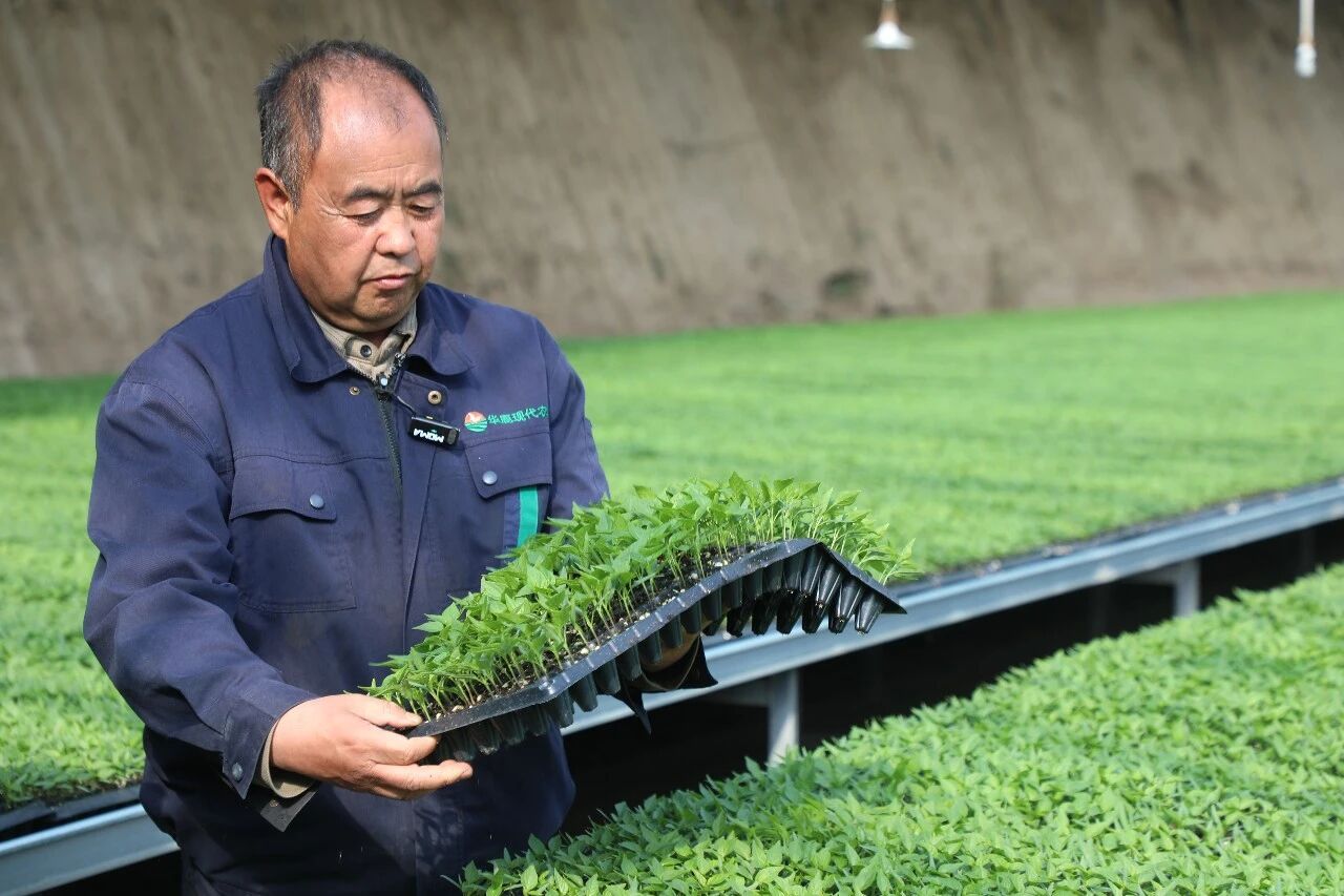 视线转向内蒙古华鹿现代农业发展有限公司的育苗基地,这里又是另一番热火朝天的景象。巨大的连栋温室内,温暖湿润,绿意盎然。工人们正在苗床间穿梭,忙着管护、装盘。一盘盘嫩绿的辣椒苗、黄瓜苗、西红柿苗整齐排列,长势喜人,仿佛一片绿色的“苗毯”。