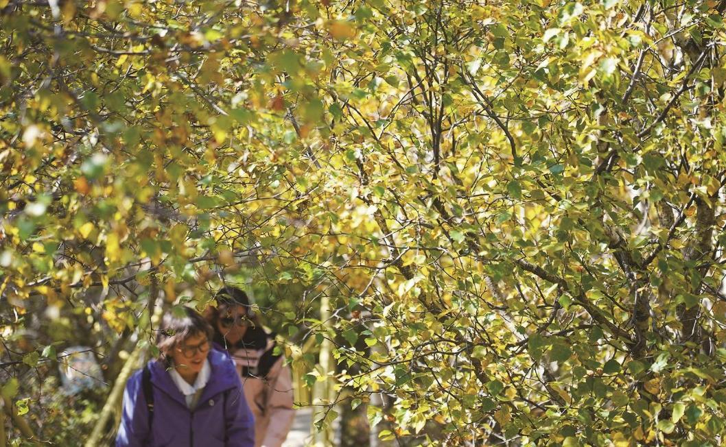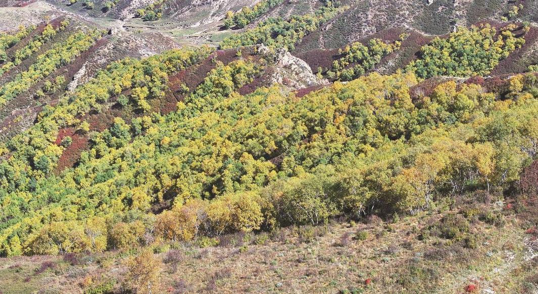 此刻,风掠过6000余亩的次生林,带着大青山的清冽,白桦树叶簌簌飘落,铺满栈道,每一步都似踩在时光的琴弦上。而柠条则在翠绿梢头点缀着些浅黄,与远处黛青山脊交织,如水墨画卷。