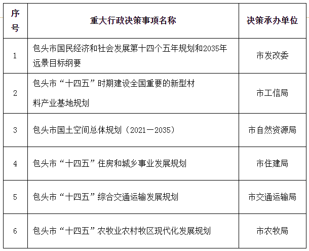 为贯彻落实《内蒙古自治区重大行政决策程序规定》,进一步规范重大行政决策程序,促进政府科学、民主、依法决策,经市人民政府同意,现将《包头市政府2021年度重大行政决策事项目录》印发给你们,请各有关部门要严格按照公众参与、专家论证、风险评估、合法性审查、集体讨论决定等法定程序组织实施。