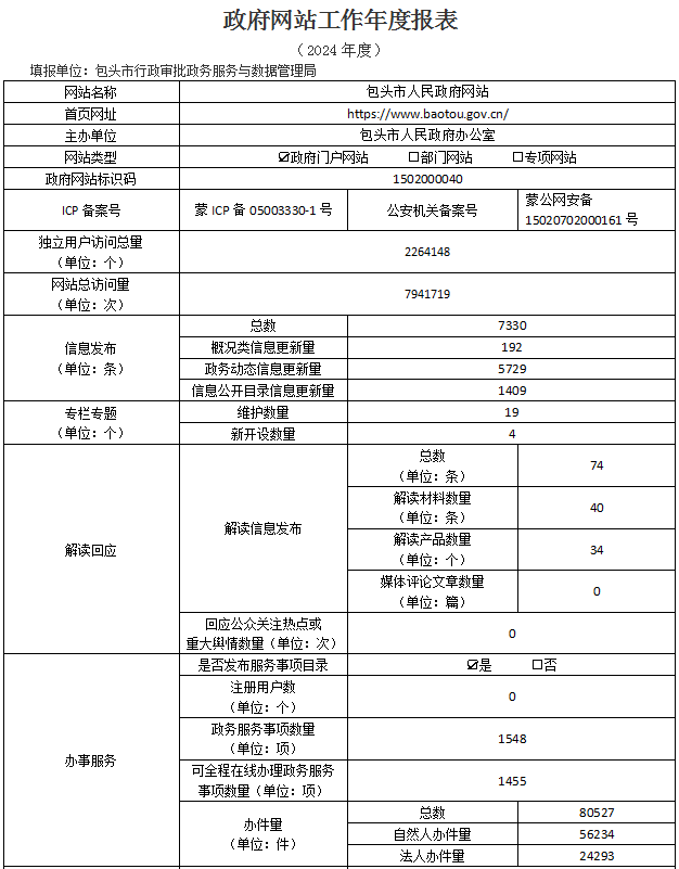 包头市人民政府门户网站2024年工作年度报表