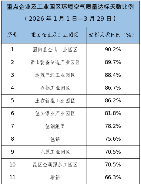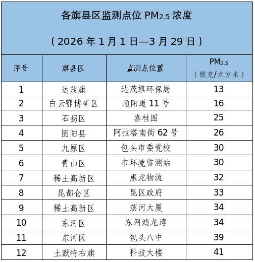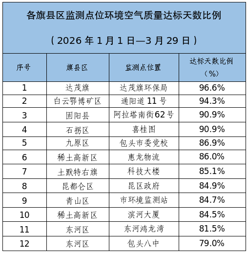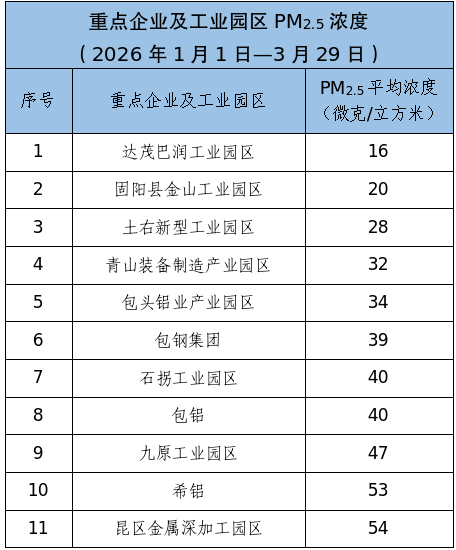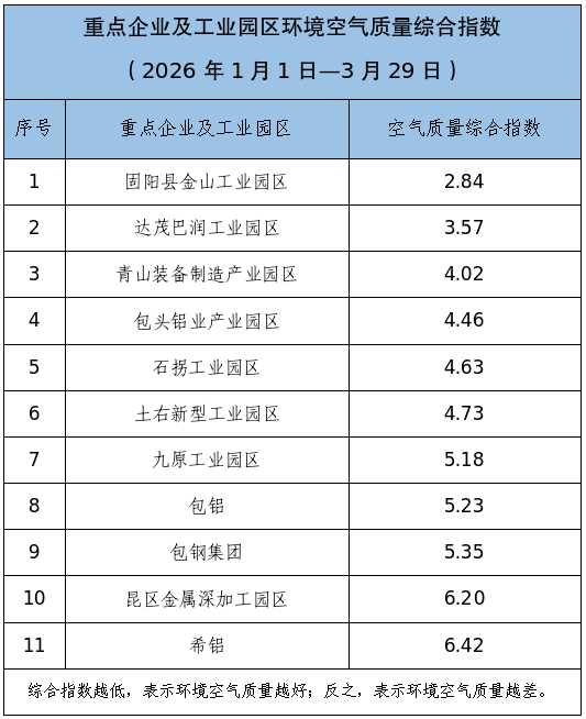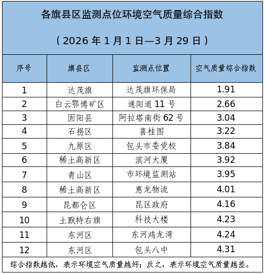 包头市各旗县区、重点企业及工业园区环境空气质量公示(2026年1月1日—2026年3月29日)