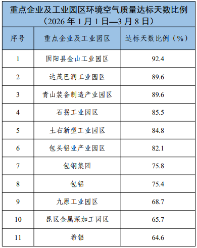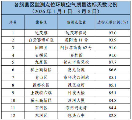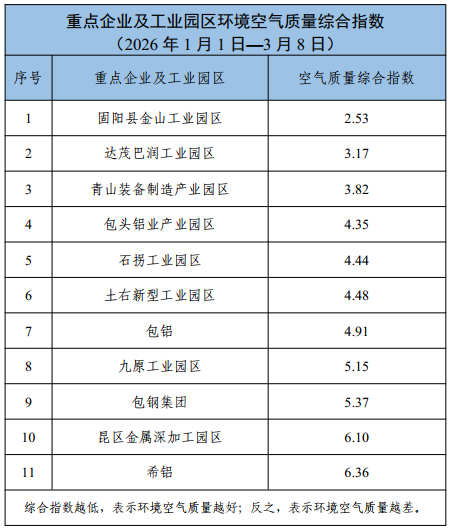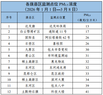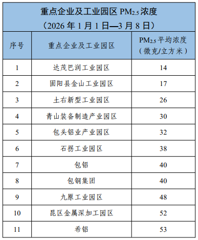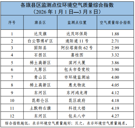 包头市各旗县区、重点企业及工业园区环境空气质量公示(2026年1月1日—2026年3月8日)