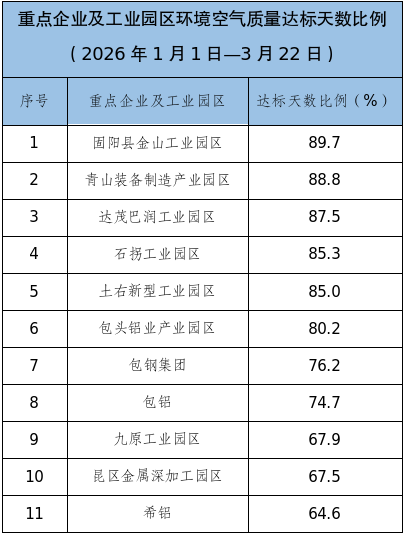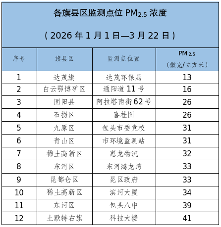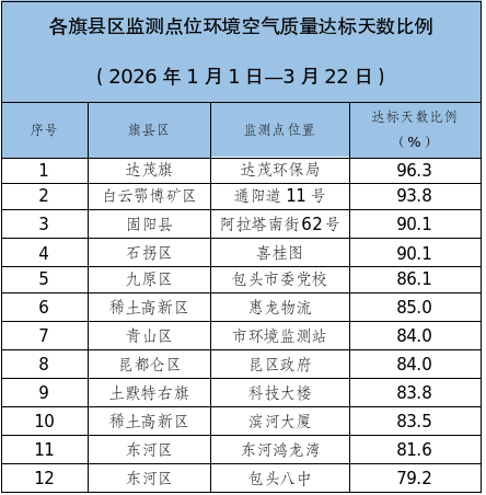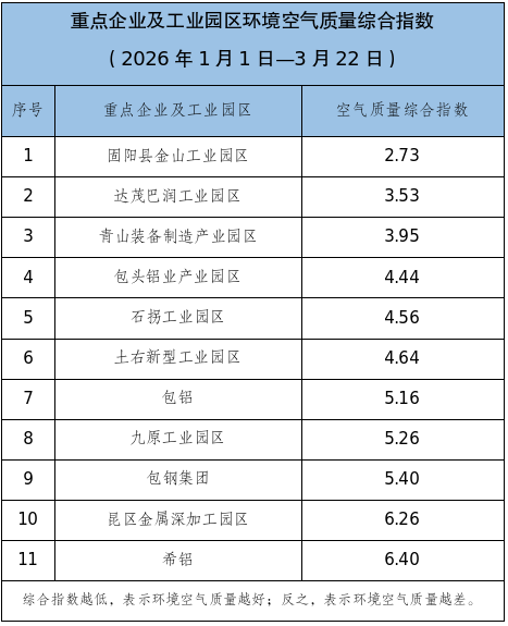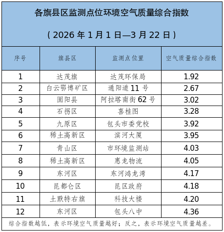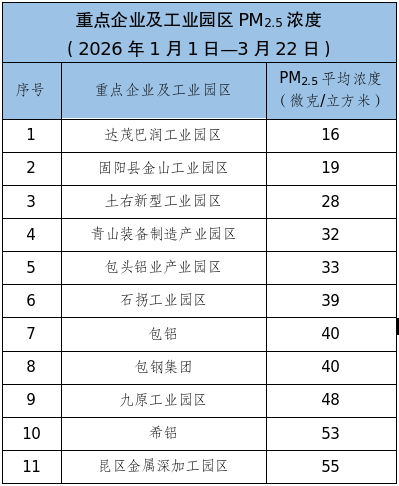包头市各旗县区、重点企业及工业园区环境空气质量公示(2026年1月1日—2026年3月22日)