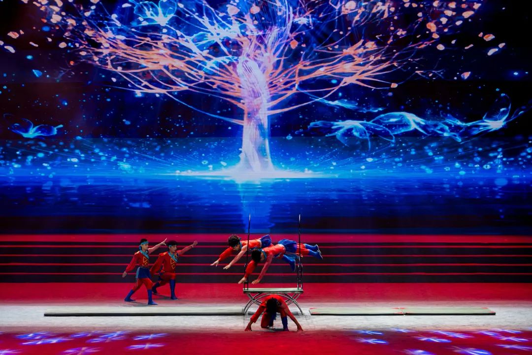 最让全场沸腾的,是杂技《台圈》的表演。当演员在空中完成连续穿越圆环的高难度动作时,全场瞬间沸腾,惊叹声一波接着一波,少年们都举着手机拍摄,生怕错过任何一个精彩瞬间,屏幕的光亮与舞台灯光交相辉映,成了剧场里独特的“星光”。