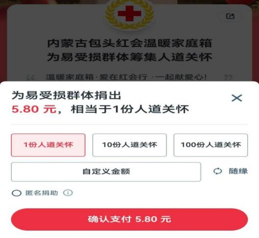 (三)选择捐赠金额,选择“1份人道关怀”为5.80元、“10份人道关怀”为58.00元、“100份人道关怀”为580.00元,您也可以自定义捐赠金额,或者点击随缘按钮系统帮你填写捐赠金额。选好金额后,点击“确认支付”,进行捐赠。