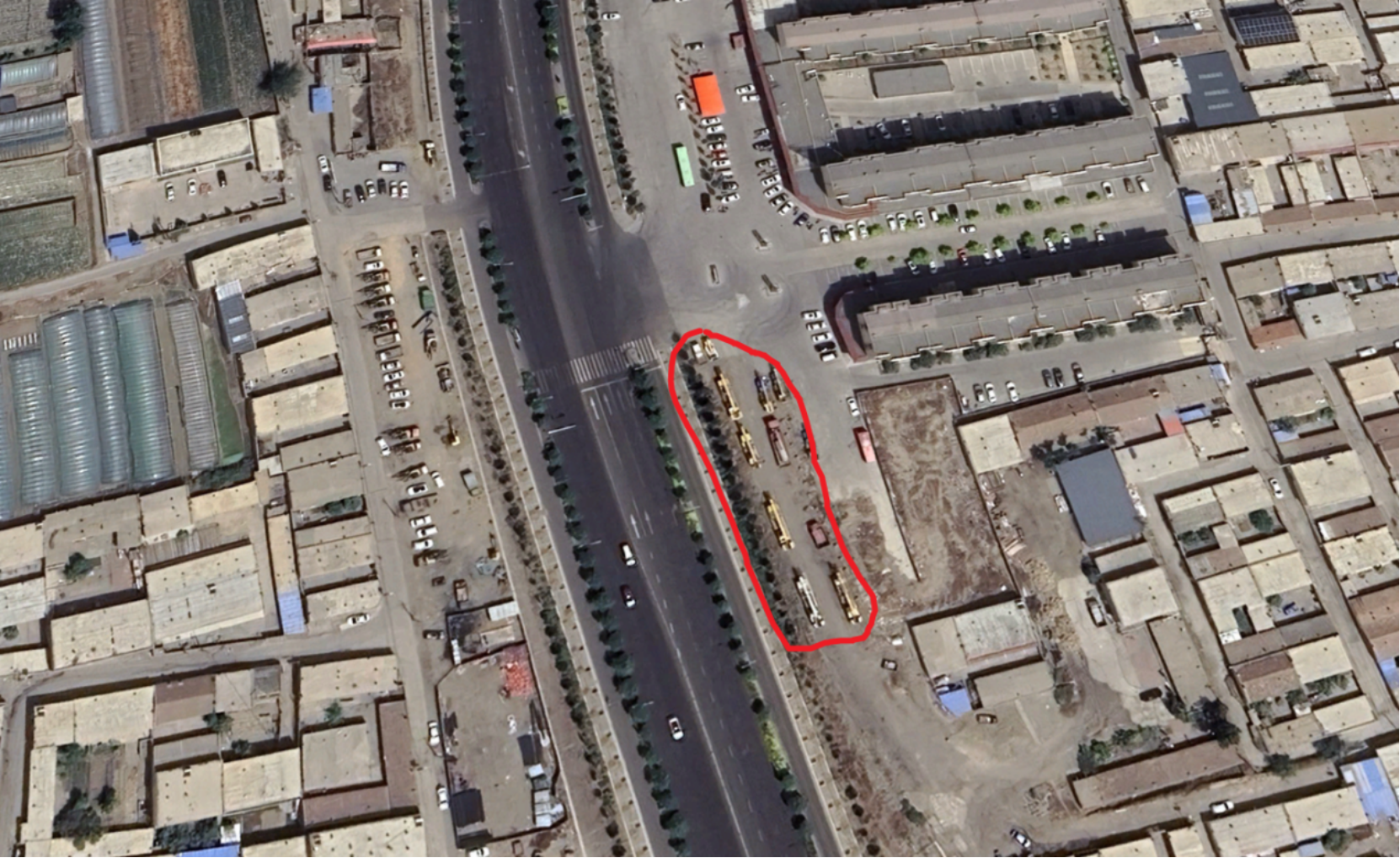 39路公交车始发站位于华鹿温泉小镇西门位置,该位置南北向道路为民族东路,南北向连接S315省道、包哈公路,距离北侧包哈公路交叉口直线距离约290米,日常客货运交通流量比较大。华鹿温泉小镇始发站停车场旁边为麻池镇永茂泉村自建砂石路,砂石路路侧并排停放有大型专项作业车辆,未占用民族东路等城市道路。