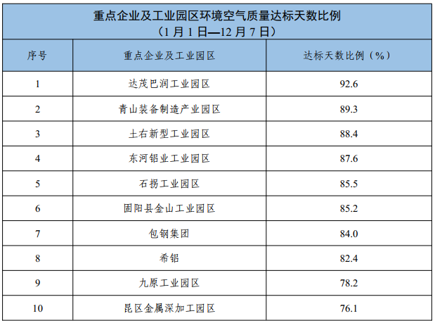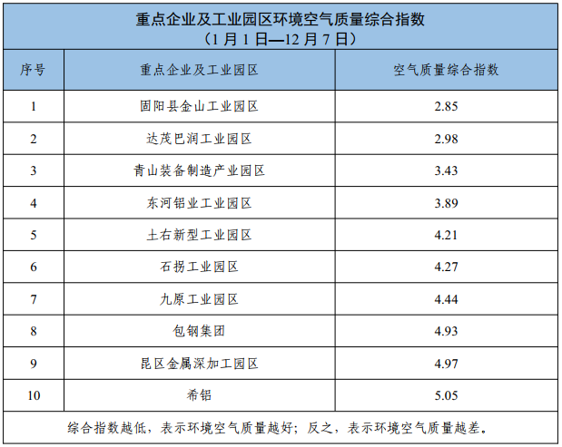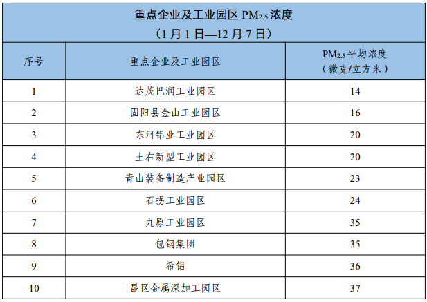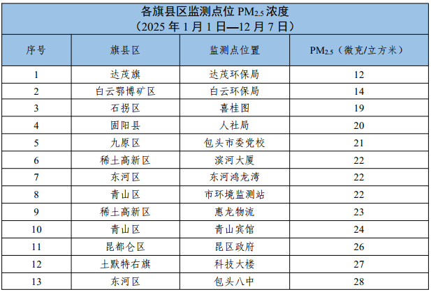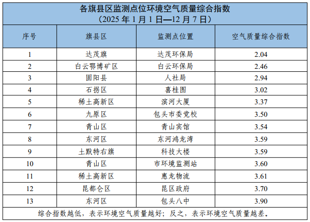 包头市各旗县区、重点企业及工业园区环境空气质量公示(2025年1月1日—2025年12月7日)