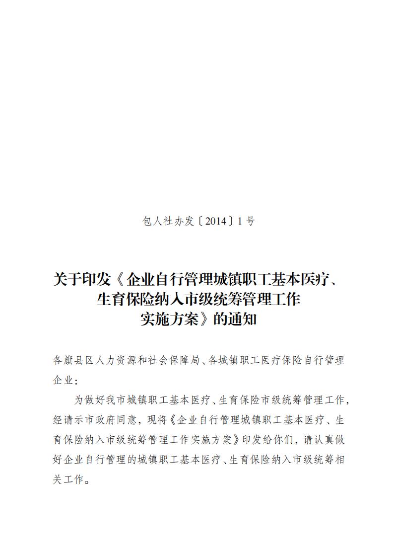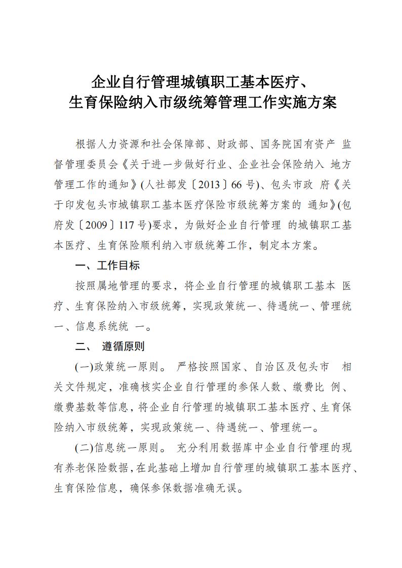 关于印发《企业自行管理城镇职工基本医疗生育保险纳入市级统筹管理工作实施方案》的通知