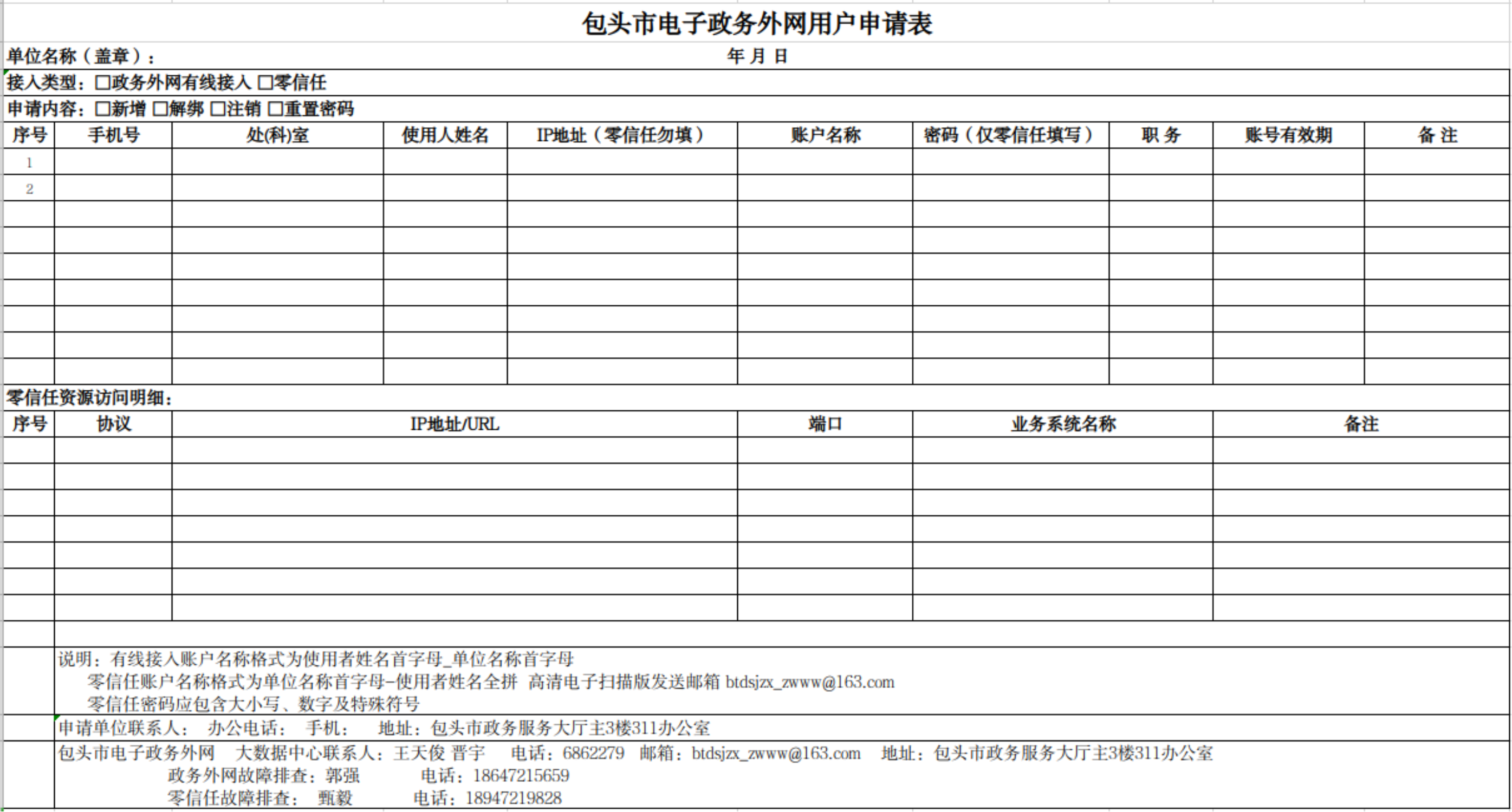 (二)零信任用户账号变更。接入单位新增零信任账号需向政务外网主管部门提交申请函,写明接入依据、使用期限、具体使用内容。变更零信任账号需填写《包头市电子政务外网用户申请表》(附件5),提交至政务外网运行管理部门审核后,予以变更。