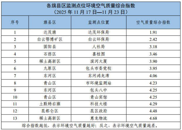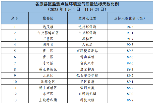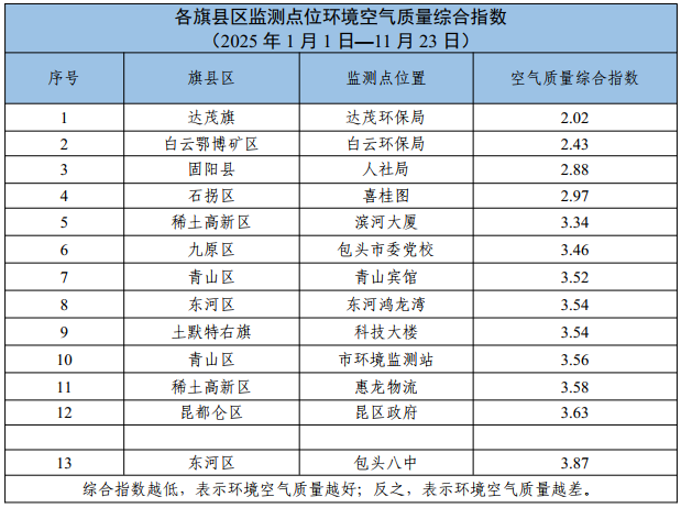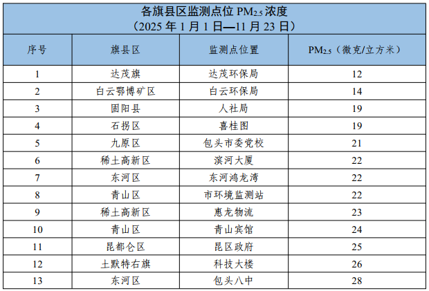 包头市各旗县区、重点企业及工业园区环境空气质量公示(2025年1月1日—2025年11月23日)