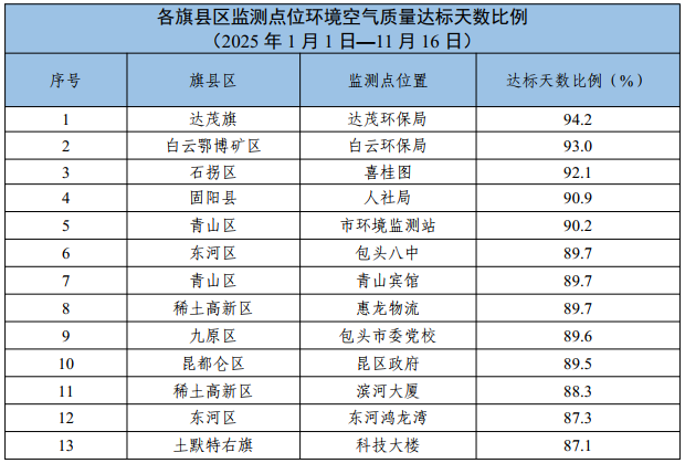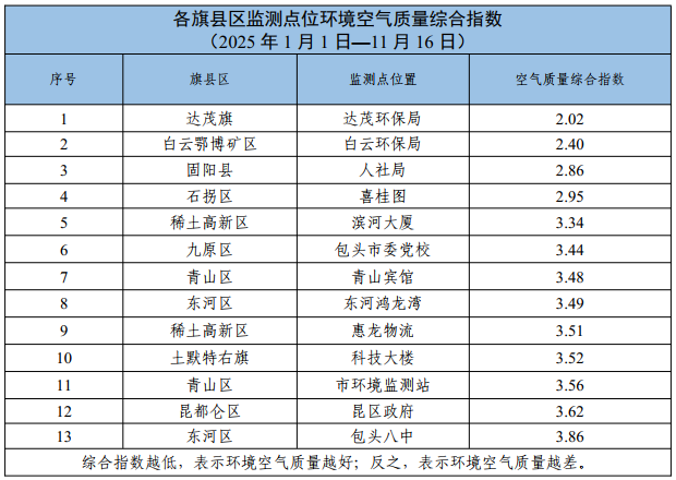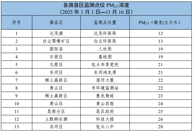 包头市各旗县区、重点企业及工业园区环境空气质量公示(2025年1月1日—2025年11月16日)